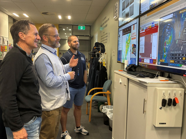 Julian Snowball (centre) with WRC Chief Executive Chris McLay (left) and WRC Director of Integrated Management Greg Ryan (right) in the Waikato Group EOC this morning.