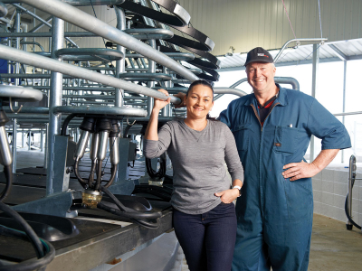 John runs the milking and manages the staff and herd, and Debbie manages the business office, calf rearing and relief milking when needed.