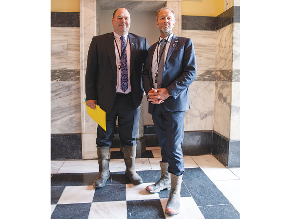 ACT MPs Mark Cameron (right) and Associate Agriculture Minister Andrew Hoggard make their way to the House with gumboots.