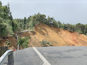 A section of damaged 25A highway after Cyclone Gabrielle hit parts of the North Island in February last year. Photo Credit: NZTA.