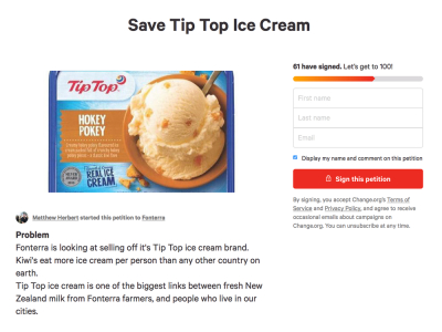 “Tip Top ice cream is one of the biggest links between fresh New Zealand milk from Fonterra farmers, and people who live in our cities,” he says in his Change.org petition.