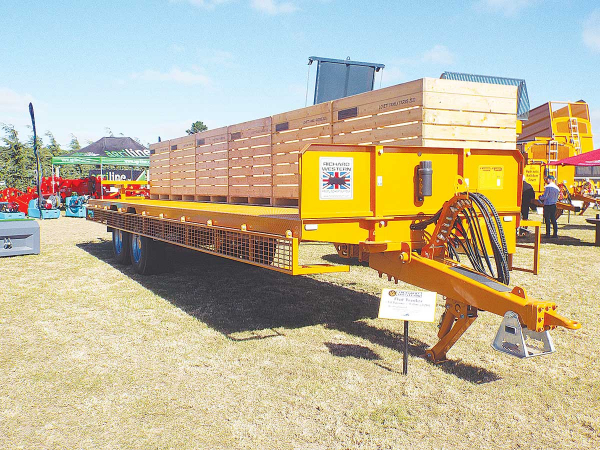One such trailer was spotted taking a front and centre position at Kirwee, in the form of a 9.8m (32 foot) tandem-axle unit set up for bales, pallets or bins, offering a 14 tonne capacity, with drop-side walkways, rope rails and a rear hydraulic box pusher. General construction sees 6mm formed steel sections running front to rear, deep "U" section chassis runners and a 4.5mm steel chequer plate platform.