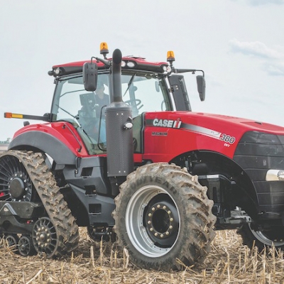 Case IH says the Magnum 380 CVT won the title thanks to features such as continuously variable transmission (known as CVX in Europe), multi-controller armrest, new LED lighting and its Rowtrac combination of rear tracks and low pressure front tyres. This gives greater traction with minimal soil disturbance compared to standard single-track machines.