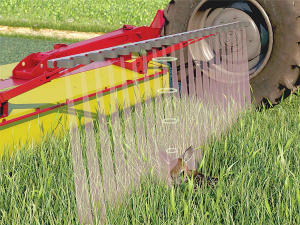 Currently, a second system is being tested for rear-mounted mower setups, covering the whole working width of the machine, mounted on an intermediate frame between the tractor and the mower. When an animal is detected, the operator can lift the rear mower, leaving an uncut area to protect the animal, or stop and move the animal out of the danger zone.