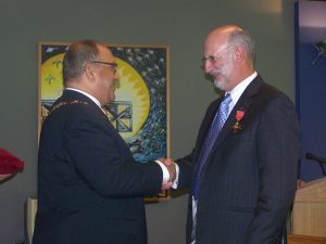Colin Harvey receiving his Officer of the New Zealand Order of Merit Insignia from then Governor General Sir Anand Satyanand in April 2008.
