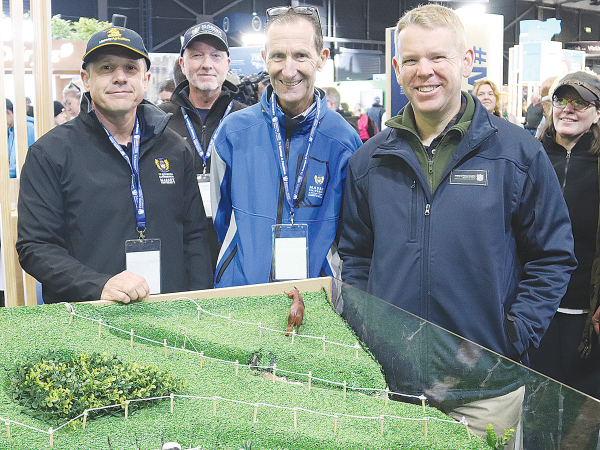 PM Chris Hipkins pictured at the Massey University Fieldays site along with Paul Kenyon and Ray Goer.