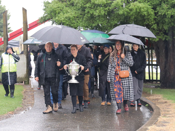 While the actual field day did not go ahead, representatives of the other finalists - the Ngati Hine Forestry Trust from Northland and the Otama Marere Trust from nearby Paengaroa - had arrived for the event. It was decided that they and some of the staff from MPIC and a few special guests would be welcomed onto the marae with the Ahuwhenua Trophy and given a brief presentation and later kai. But while this went ahead, the rain just continued to pour down.