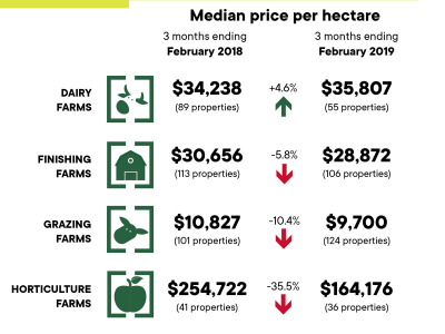 The median price per hectare for all farms sold in the three months to February 2019 was $22,462 compared to $27,523 recorded for three months ended February 2018 (-18.4%). The median price per hectare fell 17.1% compared to January 2019.