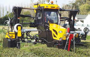 Dubbed ‘The Transformer’ the 100hp unit is a one-off built to Zealong’s specifications. It uses a hydrostatic driveline to maintain speeds from 0-25km/h; it covers 0.5ha/hour during trimming. The machine lives up to its nickname with a range of interchangeable task-specific attachments.