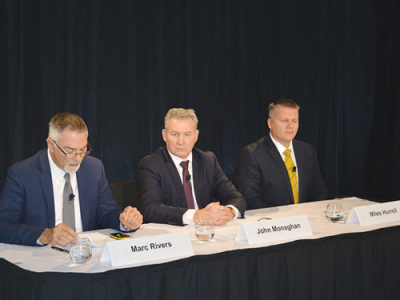 Fonterra’s CFO Marc Rivers, chair John Monaghan and CEO Miles Hurrell fronting at this year’s annual result briefing.