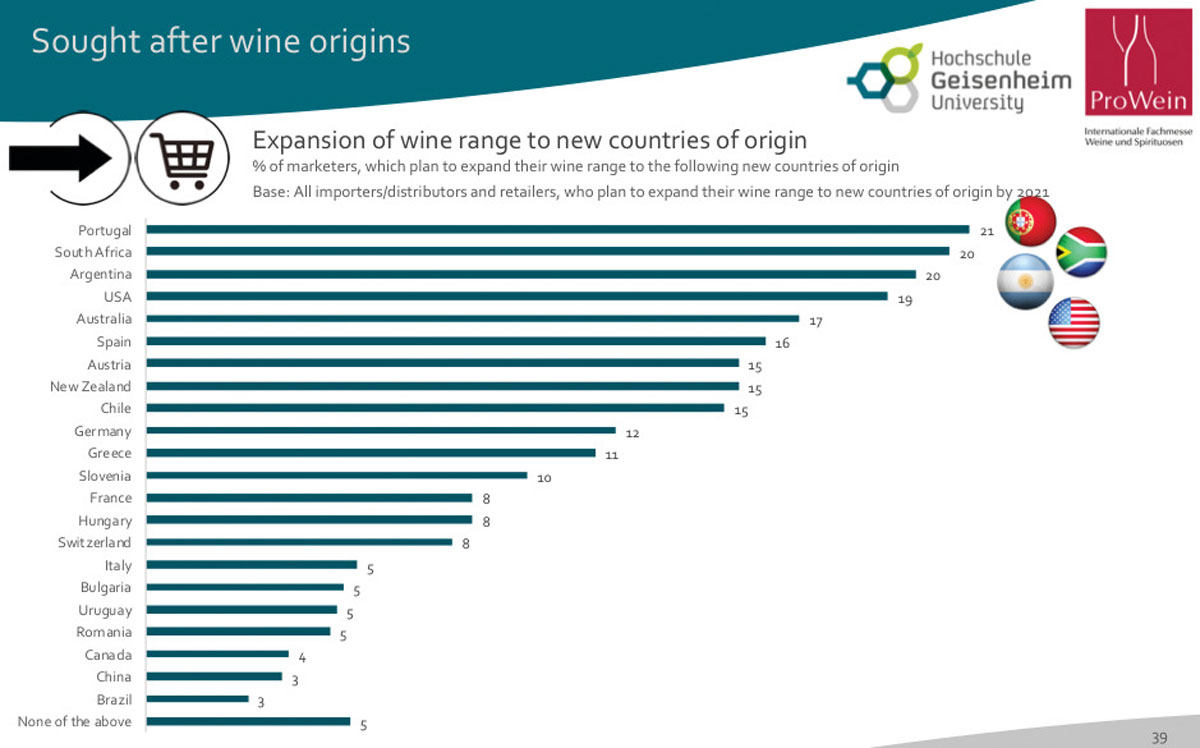 Nearly one in two wine retailers who visited ProWein said they were looking to expand their portfolios to make their wine lists more interesting. In terms of countries of origin they were interested in, Portugal came out number one, South Africa was second, followed by Argentina, US, Australia, Spain, Austria and then New Zealand was in 8th place, with 25 percent of those surveyed wanting to add New Zealand wines to their portfolios.